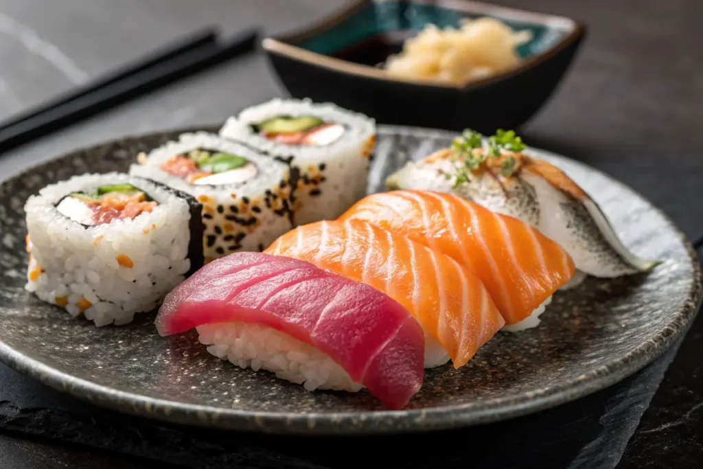 An overview of the three main types of sushi, featuring nigiri, sashimi, and maki rolls.