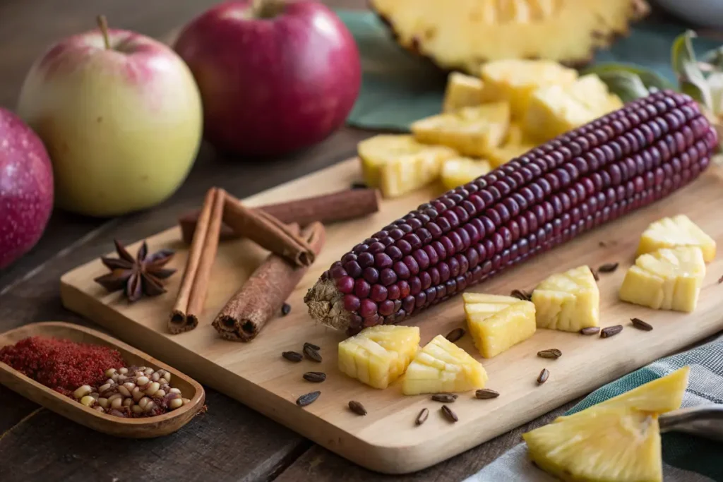 The heart of this drink is purple corn, or maíz morado, a vibrant variety grown in Peru. It gives the drink its signature deep color, earthy flavor, and traditional touch.