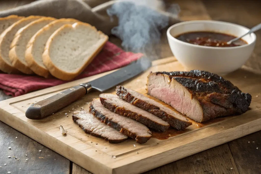 Perfectly smoked brisket sliced and ready to serve, accompanied by fresh bread and barbecue sauce.