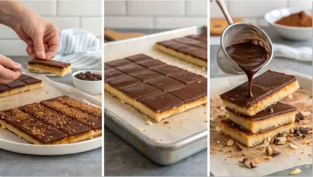 - Pour the melted chocolate over the top of the assembled bars, ensuring full coverage.
