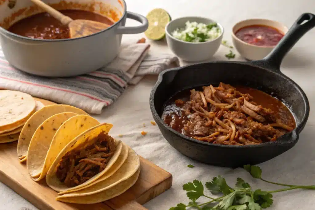 The process begins with marinating the meat in a rich blend of dried chilies, garlic, vinegar, and spices. This step allows the flavors to penetrate deeply, ensuring that every bite is infused with smokiness, heat, and savory goodness. Once marinated, the meat is braised in a spiced broth for several hours until it becomes so tender that it easily shreds apart with a fork.