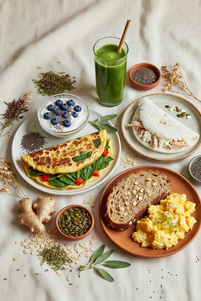 Benefício principal: Os ovos são a fonte proteica com maior biodisponibilidade disponível, com índice de qualidade proteica (PDCAAS) igual a 1.0, o máximo possível. A adição de legumes crucíferos como espinafre e couve fornece indol-3-carbinol, que suporta a depuração hepática de estrogênio e melhora o equilíbrio hormonal em mulheres.