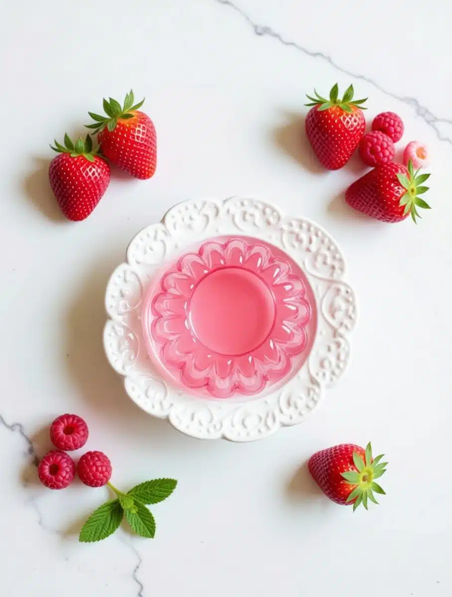 Gelatina com frutas de baixa caloria: morangos, framboesas e melao sao excelentes opcoes para adicionar textura, vitaminas e antioxidantes sem comprometer o total calorico. Quatro a cinco morangos cortados ao meio adicionam apenas 15 a 20 calorias extras e transformam a apresentacao da receita.