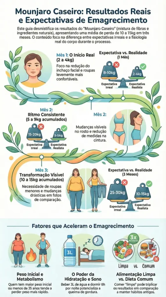 Se você está procurando “mounjaro caseiro emagrece quantos quilos” esperando ouvir que vai perder 10kg em 2 semanas, sinto decepcionar. Mas se você quer saber os resultados REAIS que pessoas comuns estão tendo, continue lendo.