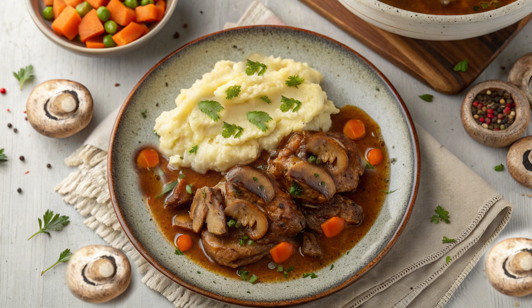 - Add broth gradually, stirring to create a thick gravy.